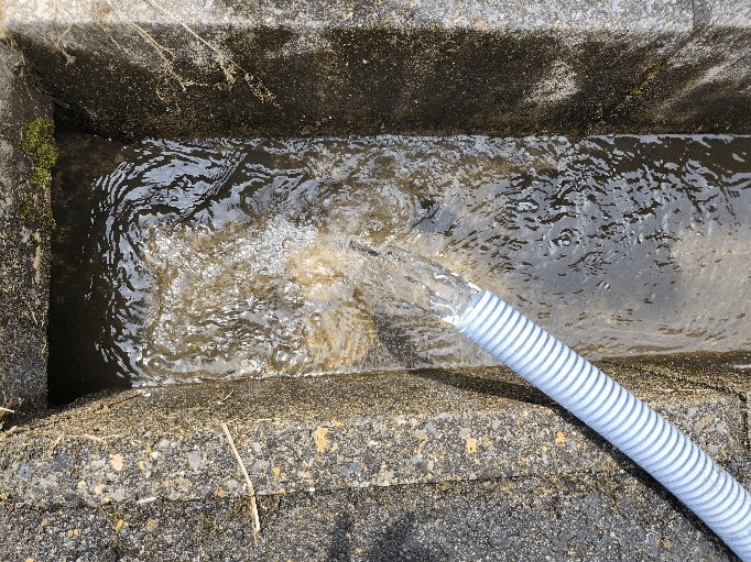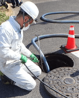 自社の高圧洗浄機を使用し、ノズルから噴射した時の衝撃力を利用して、排水口、排水マスを洗浄します。