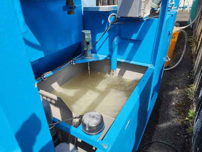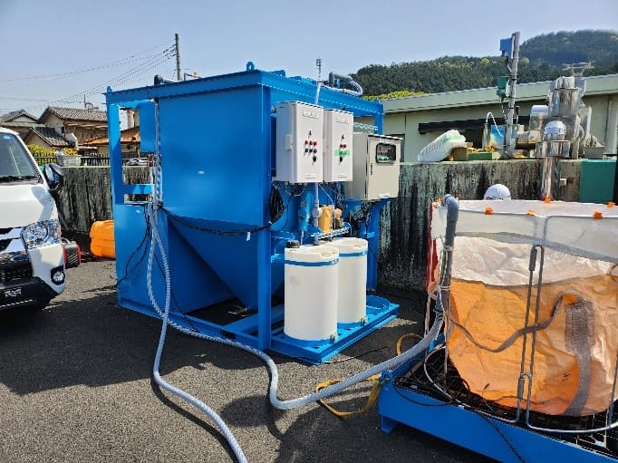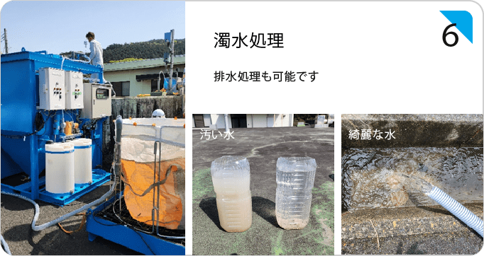 その後、撹拌から分離処理等を行い、濁りのない水として排水処理