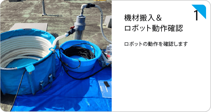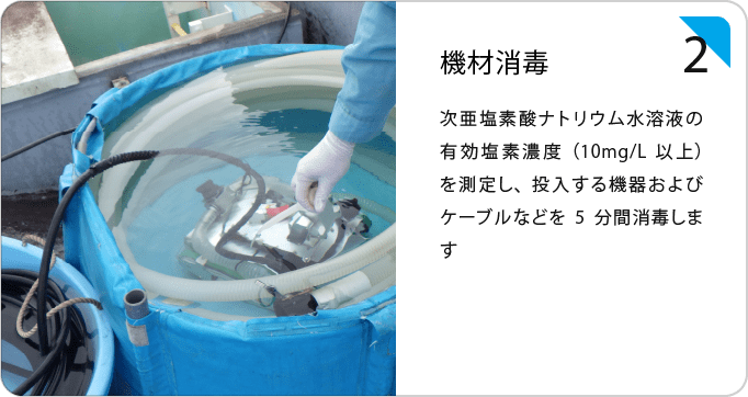 1安全面と衛生面の安心 清掃作業員が槽内に入らないので、事故などのリスクが回避できます。作業前には機材をすべて次亜塩素酸ナトリウムで十分に消毒した上で行っています。水深15~40mまで対応できるので規模の大小も問いません。
