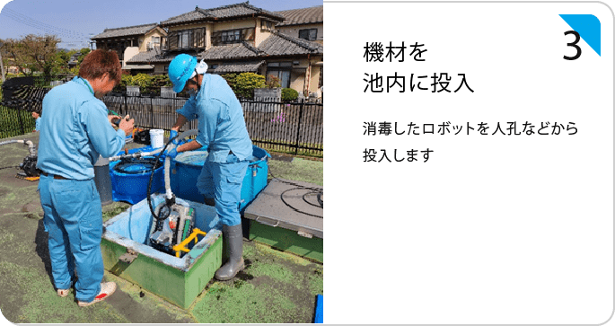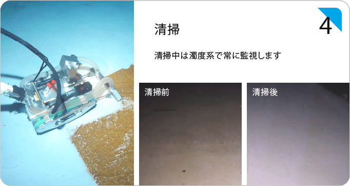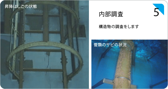 | 水抜き清掃 | 潜水士による調査清掃 | ロボット調査清掃 | |