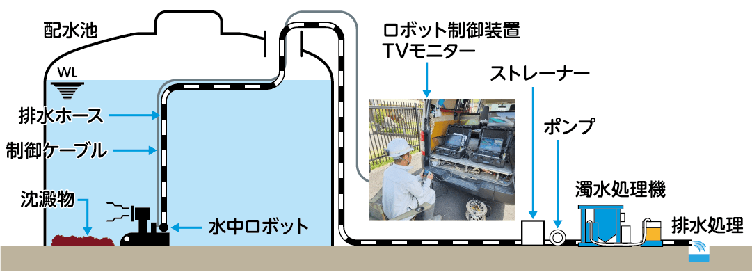 水中ロボットは特殊構造の吸い込み口でこれらの堆積物を除去するため、