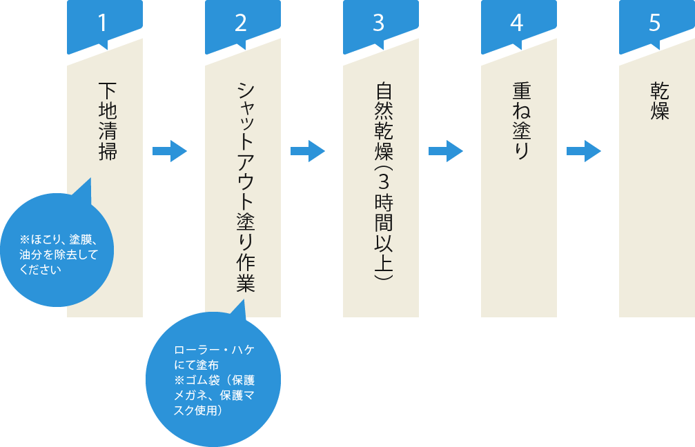 シャットアウトを使用時は下地の清掃をしっかりと行い、その上から塗って頂くだけで臭いの元を封じ込めます。誰でも簡単にでき施工時間が大幅に短縮できます。